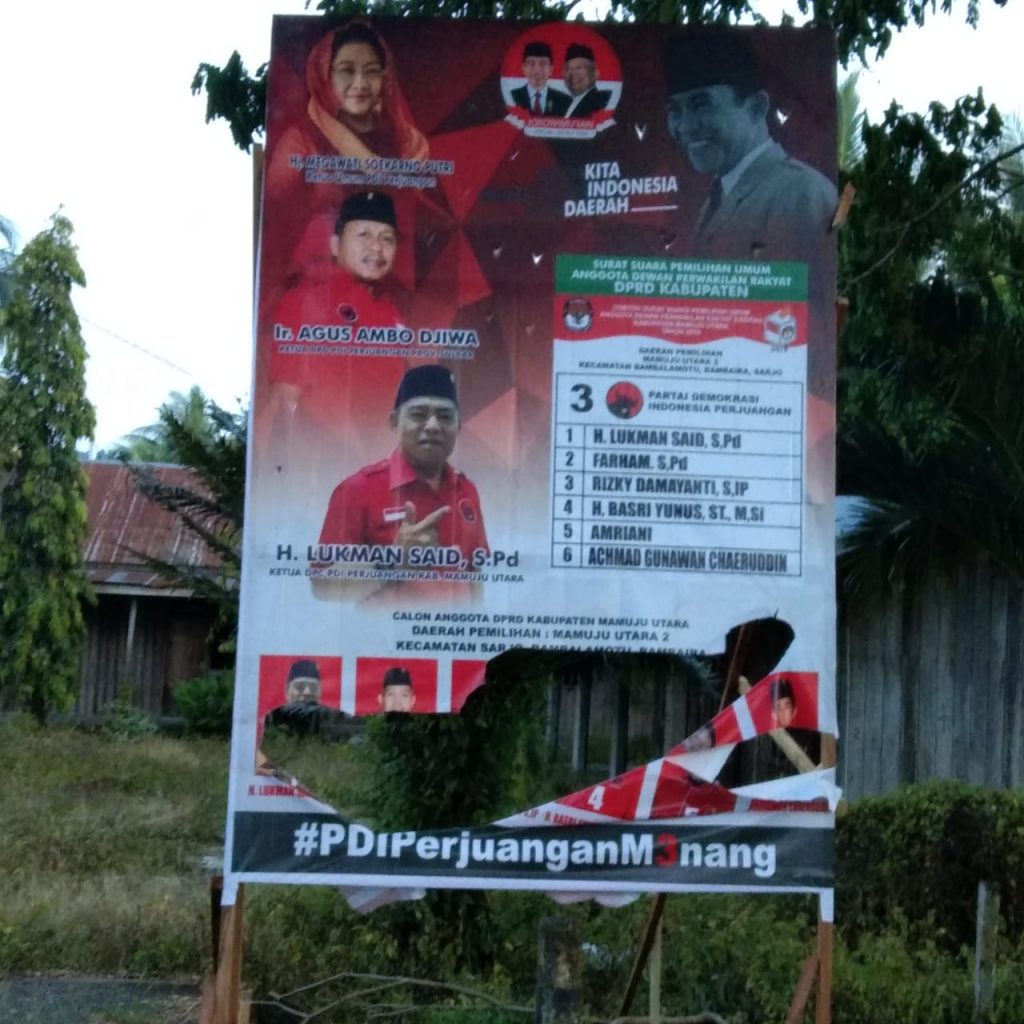 Nampak Baliho yang berukuran cukup besar itu seperti disayat sebuah benda tajam, membuat beberapa gambar wajah dalam baliho itu hilang. Ini membuat pengurus DPC PDIP Pasangkayu geram. Kasus inipun telah dilaporkannya ke Bawaslu dan KPU Pasangkayu.