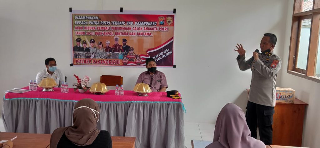ekspossulbar.com,PASANGKAYU– Jajaran Polres Pasangkayu melakukan sosialisasi rekrutmen anggota Polri tahun 2021. Menyasar SMAN 1 Pasangkayu, Rabu 10 Maret.