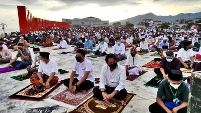 MAMUJU – Salat Id 1 Syawal 1442 H yang dilaksanakan di Anjungan Pantai Manakarra berjalan hikmat, Kamis 13 Mei 2021. Ribuan warga Mamuju memadati area tersebut untuk menjalankan Salat Id.