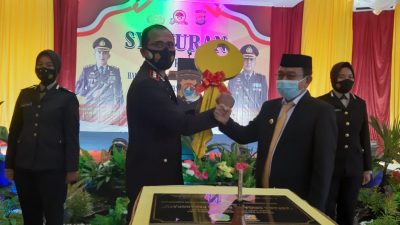 PASANGKAYU– Bupati Pasangkayu Yaumil Ambo Djiwa menyerahkan kunci rumah dinas (rumdis) secara simbolis kepada Kapolres AKBP Leo H Siagian, disela-sela acara syukuran hari Bhayangkara ke 75, Kamis 1 Juli.