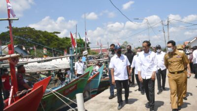 KABUPATEN CIREBON – Gubernur Jawa Barat Ridwan Kamil mendampingi Presiden RI Joko Widodo melakukan kunjungan kerja beraudiensi dengan nelayan, di Pasar Ikan Selo Pengantin Desa Bandengan, Kecamatan Mundu, Kabupaten Cirebon, Rabu (13/4/2022).