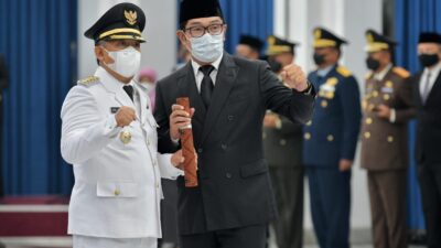 KOTA BANDUNG — Gubernur Jawa Barat Ridwan Kamil melantik Yana Mulyana menjadi Wali Kota Bandung sisa masa jabatan 2018 – 2023, di Aula Barat Gedung Sate, Kota Bandung, Senin (18/4/2022).