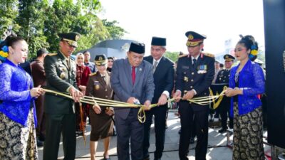 Usai upacara, para pimpinan Forkopimda Jabar meninjau pameran alat material khusus (almatsus) Polri dan UMKM Polwan Polda Jabar.