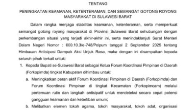 EKSPOSSULBAR.CO.ID, MAMUJU – Gubernur Sulbar, Suhardi Duka, menerbitkan Surat Edaran (SE) Nomor 40 Tahun 2025 tentang Peningkatan Keamanan, Ketenteraman, dan Semangat Gotong Royong Masyarakat di Sulawesi Barat, yang ditandatangani pada Rabu, 10 September 2025.