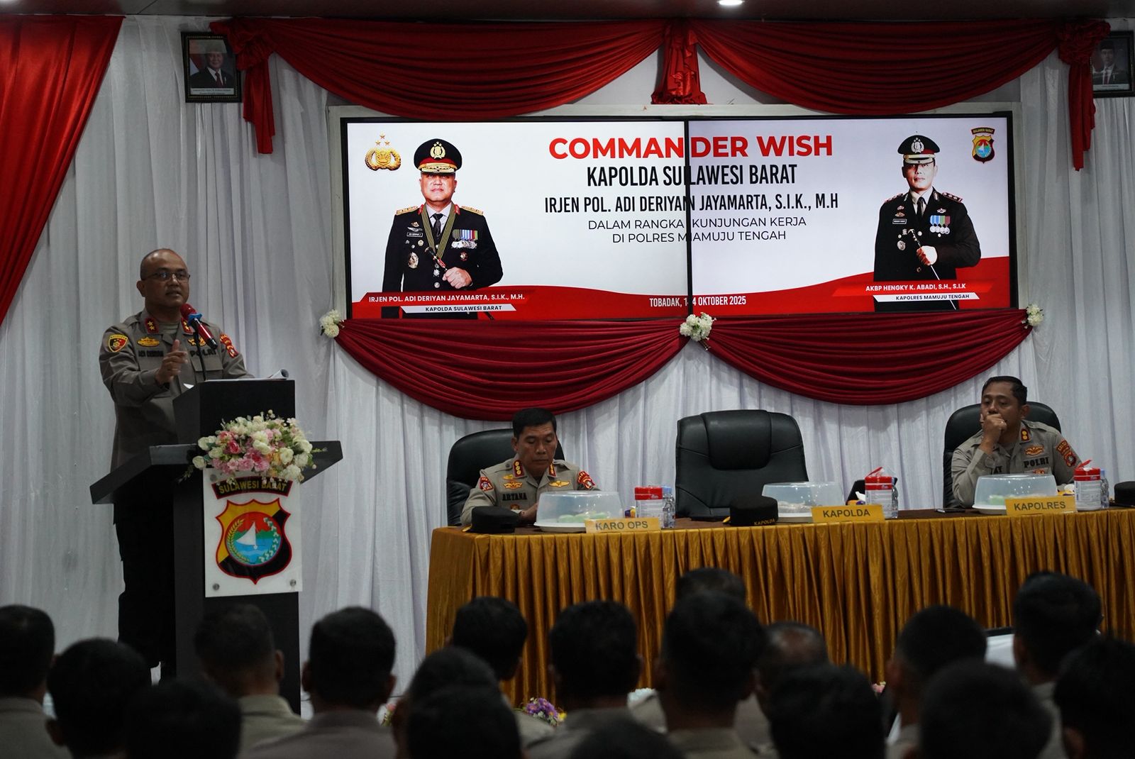 EKSPOSSULBAR.CO.ID, MATENG – Kapolda Sulbar, Irjen Pol Adi Deriyan Jayamarta, memberikan arahan inspiratif kepada jajaran Polres Mamuju Tengah (Mateng) dalam kunjungan kerjanya. Arahan tersebut berfokus pada internalisasi nilai-nilai luhur kepolisian sebagai “Abdi Utama Bagi Nusa dan Bangsa”, Selasa (14/10/25).