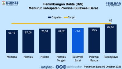 EKSPOSSULBAR.CO.ID, Mamuju — Gerakan Cinta Posyandu menunjukkan hasil positif terhadap peningkatan penimbangan balita di Sulbar. Berdasarkan data per 5 Oktober 2025, capaian penimbangan balita (D/S) Sulbar telah mencapai 71,8 persen.