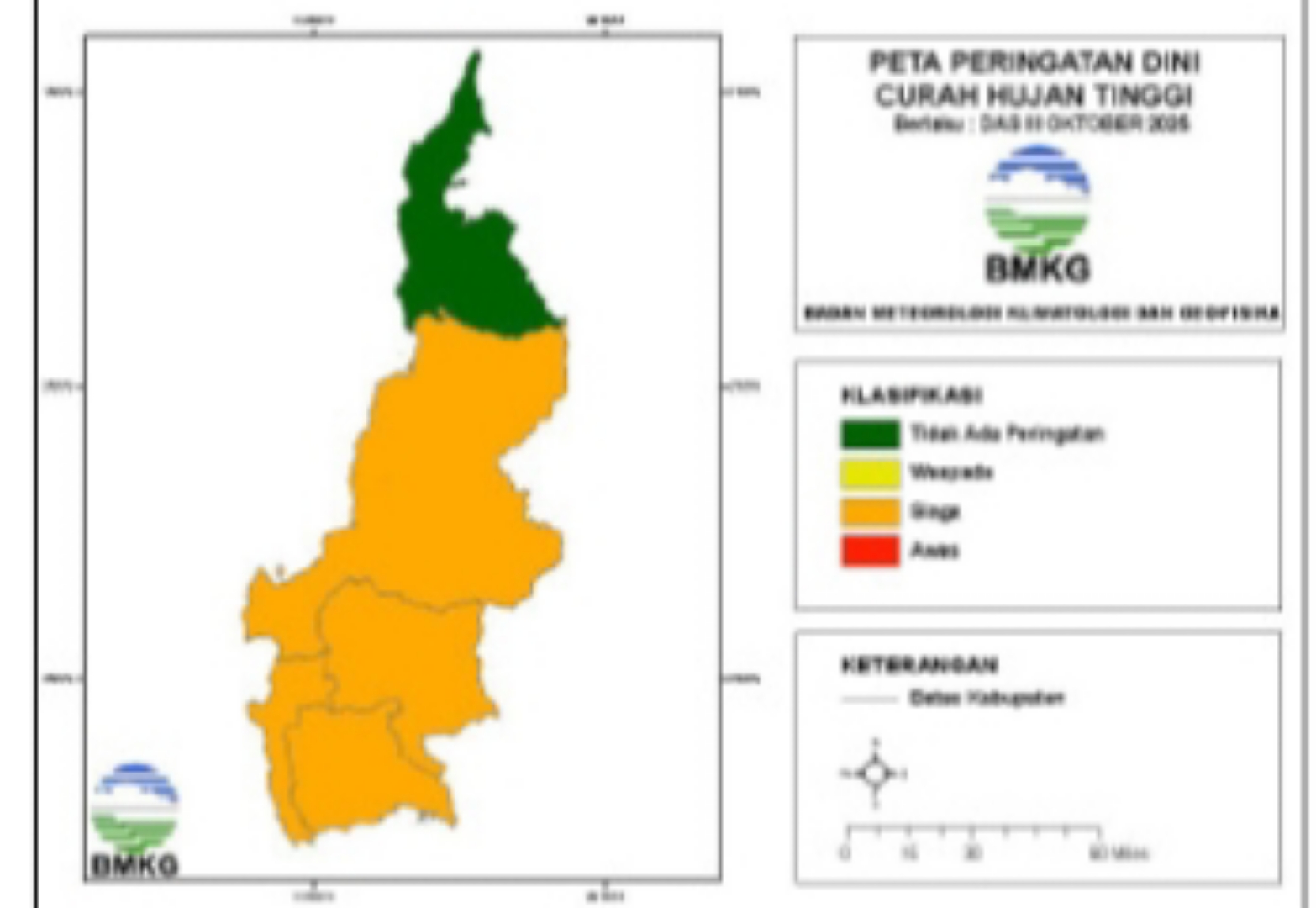 EKSPOSSULBAR.CO.ID, Mamuju — Badan Bencana Daerah (BPBD) Sulbar menerima laporan resmi dari BMKG Wilayah IV Makassar tentang Peringatan Dini Cuaca dan Iklim periode Dasarian III Oktober 2025 di Sulbar.
