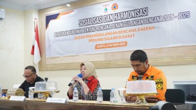 EKSPOSSULBAR.CO.ID, Mamuju — Kepala Bidang Kedaruratan dan Logistik BPBD Provinsi Sulawesi Barat (Sulbar), Arnidah, memberikan masukan penting dalam kegiatan Sosialisasi dan Harmonisasi Peraturan Gubernur (Pergub) tentang Rencana Penanggulangan Bencana (RPB) Provinsi Sulawesi Barat Tahun 2025–2029, di Hotel Grand Putra Mamuju, Kamis (23/10/2025).